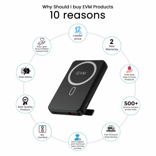 EVM Enmag Ace Magsafe Power Bank 10000 mAh (EVM P0301B) Black offers versatile and portable charging with a 10000 mAh capacity and MagSafe magnetic attachment, providing convenient and secure wireless charging for compatible devices along with reliable wired charging support. Designed in a sleek black finish with broad device compatibility and consistent performance, it ensures your gadgets stay powered on the go. Available at Golchha Computer, this EVM power bank delivers a practical and high-utility charging solution for Indian customers.