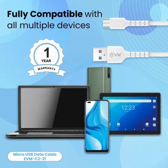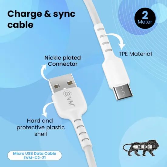 The EVM Micro USB Charge & Sync Cable (Model: EVM-C2-21-W) is a premium cable designed for fast charging and secure data synchronization for all your Micro USB-enabled devices. Built with durable materials and reliable connectors, it ensures stable power delivery and efficient data transfer. Ideal for smartphones, tablets, cameras, and other Micro USB devices, this cable provides a seamless connection for both charging and syncing. Offered by EVM, a trusted brand in electronics and accessories across India, the EVM-C2-21-W Micro USB Cable combines durability, high performance, and convenience for everyday use.