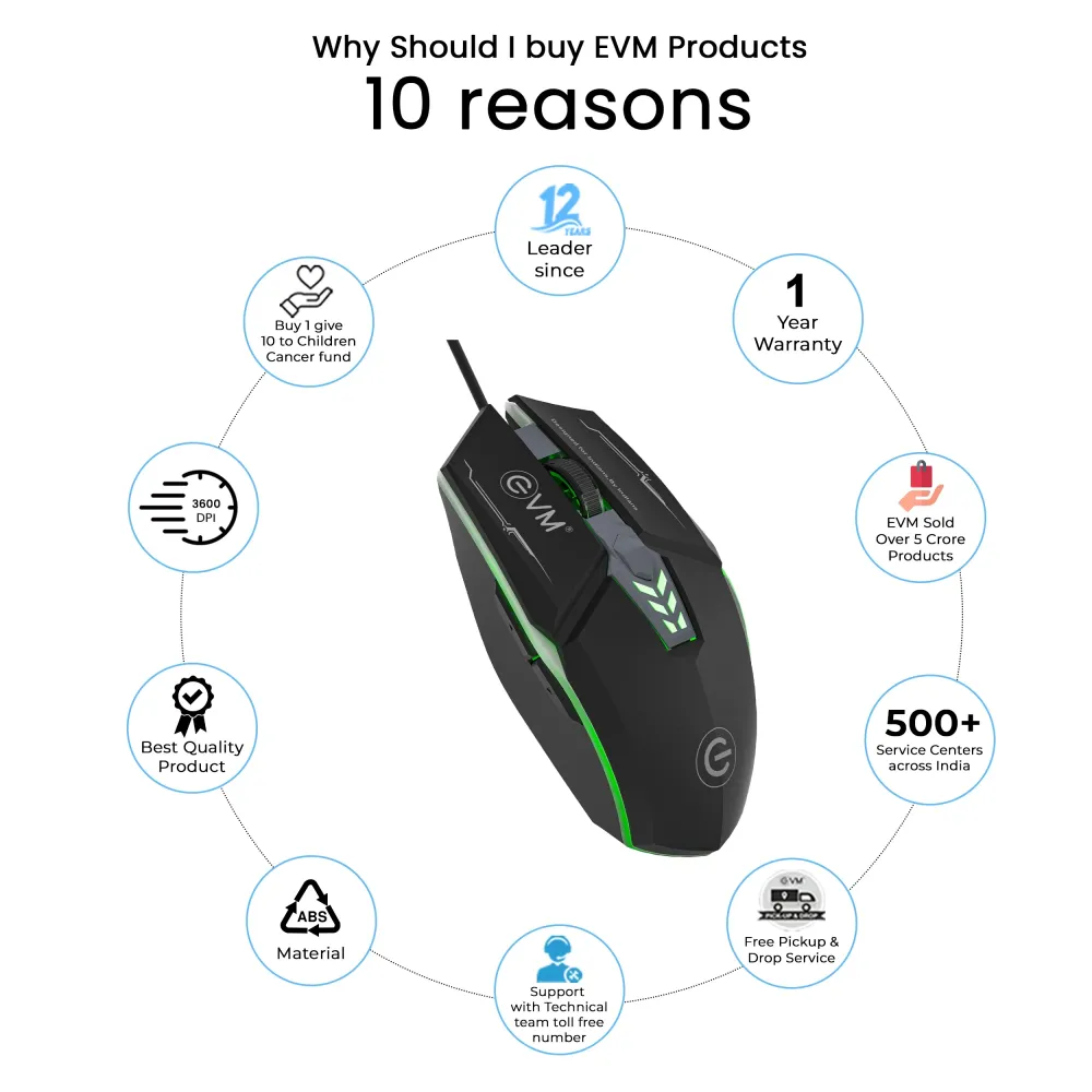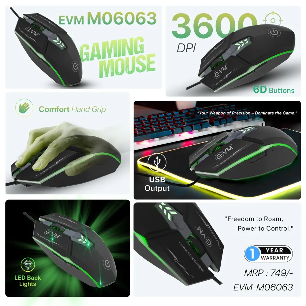 EVM Gaming Mouse USB (M06063) is a reliable wired gaming mouse designed for precision and comfort. It features an ergonomic design with responsive buttons and smooth tracking, ensuring accurate control during intense gameplay. The durable USB connection provides consistent performance without lag, while its sleek build enhances grip and stability. Available at Golchha Computer, the EVM M06063 Gaming Mouse is an ideal choice for gamers seeking performance, durability, and style at an affordable price.