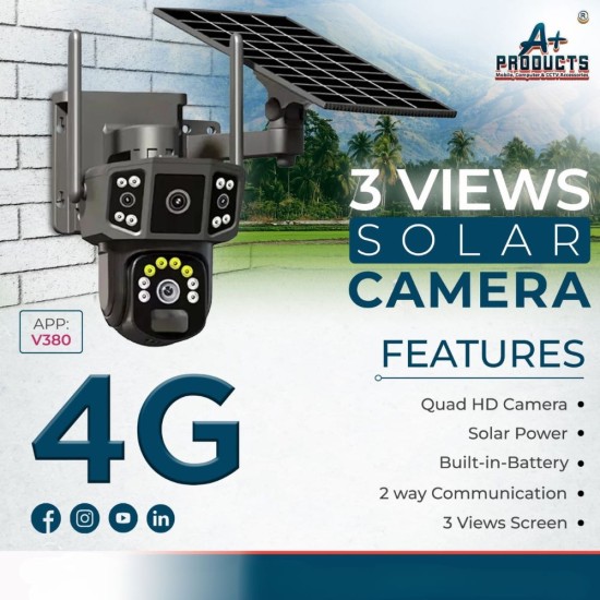 A+Products 4G Solar Camera 2MP 3 View with 2 Way Audio is a smart wireless security camera designed for outdoor use, powered by solar energy and 4G connectivity. It features a 2MP HD lens with triple-view coverage for wide surveillance and clear video quality. With built-in two-way audio, users can communicate remotely through the camera in real-time. Available at Golchha Computer, this solar-powered camera is perfect for areas without Wi-Fi, offering continuous monitoring and eco-friendly operation.