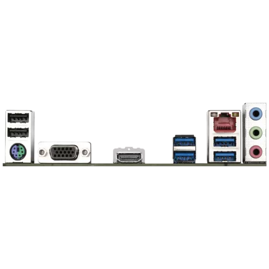 1 × PS/2 Keyboard/Mouse Port 1 × D-Sub, 1 × HDMI Port 4 × USB 3.2 Gen1, 2 × USB 2.0 Ports 1 × RJ45 LAN, 3 × Audio Jacks |