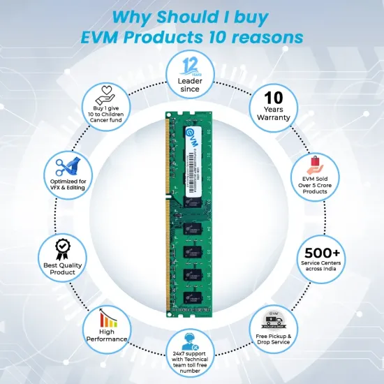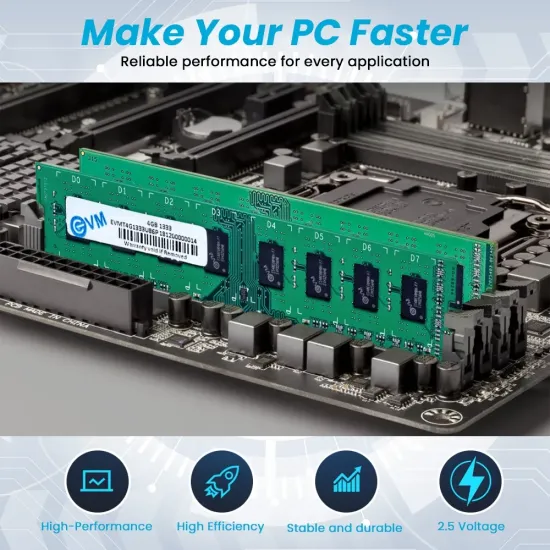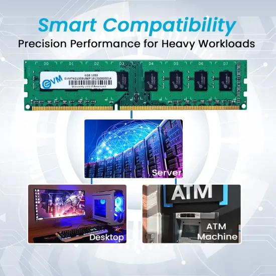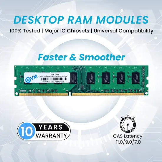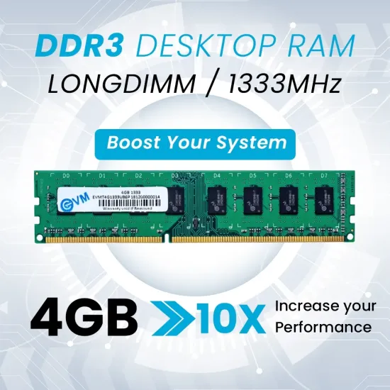 ✅ The EVM 4GB DDR3 1333MHz Desktop RAM (EVMT4G1333U86P) offers reliable performance for everyday computing. Built with high-quality chips, it ensures system stability and smooth multitasking. Ideal for desktop upgrades and general productivity use.