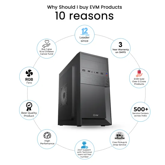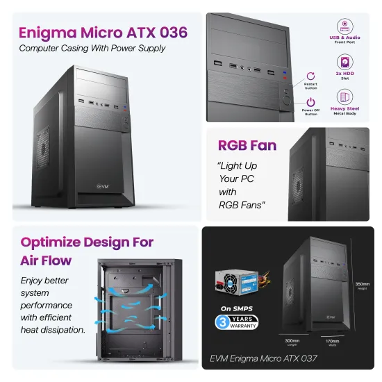 EVM Cabinet With SMPS Enigma Micro ATX 036 is a compact and efficient PC cabinet designed for Micro ATX system builds. With an included SMPS, it provides a cost-effective and ready-to-assemble solution for everyday desktop usage. Available at Golchha Computer, this cabinet is a reliable choice for users seeking durability and value in India.
