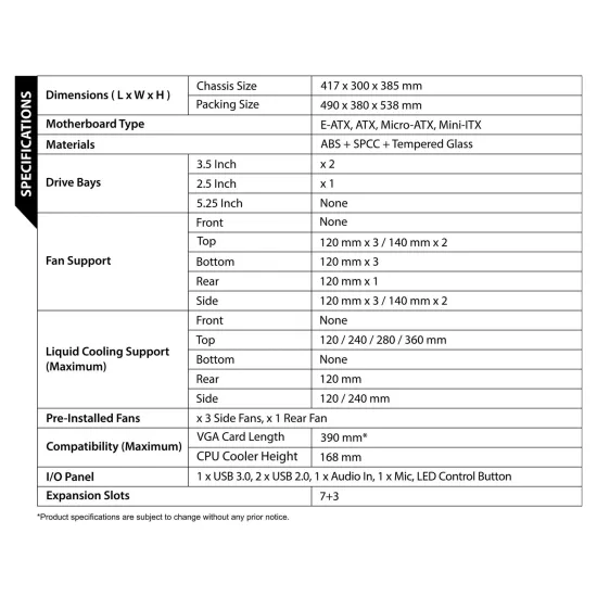| Cooling Support | Top: 3×120mm / 2×140mm, Bottom: 3×120mm, Rear: 1×120mm, Side: 3×120mm / 2×140mm |