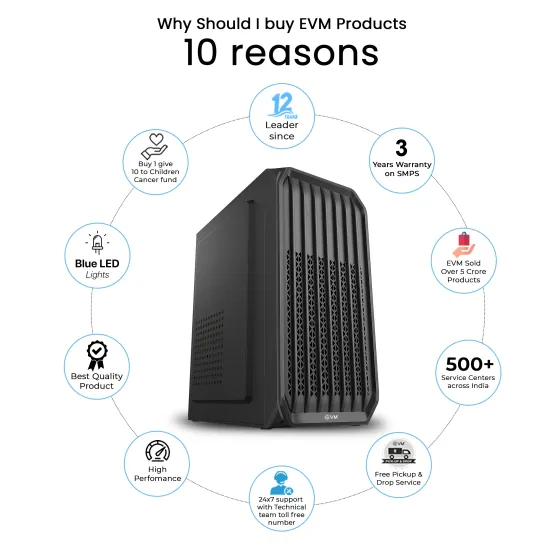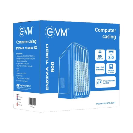 тЬЕ The EVM Enigma Turbo 900 Cabinet with SMPS is a reliable and space-saving desktop solution built with a black steel body for durability. It includes a pre-installed power supply (SMPS), supports Micro ATX and ITX motherboards, and ensures effective cooling with side and rear fan support. Ideal for office, home, or compact gaming setups, it offers strong airflow and easy installation.
