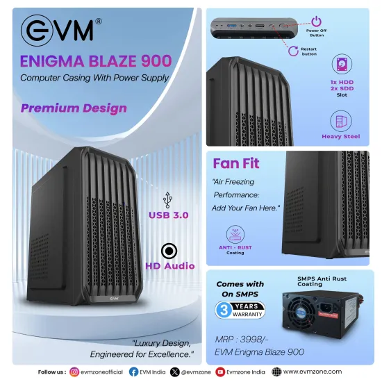EVM Cabinet With SMPS Enigma Turbo 900 is a durable and efficient desktop cabinet that comes with an integrated SMPS for convenient PC building. Designed to support essential hardware configurations, it offers good airflow and reliable performance for everyday computing needs. Available at Golchha Computer, this cabinet is an ideal choice for budget-friendly and practical system assemblies in India.