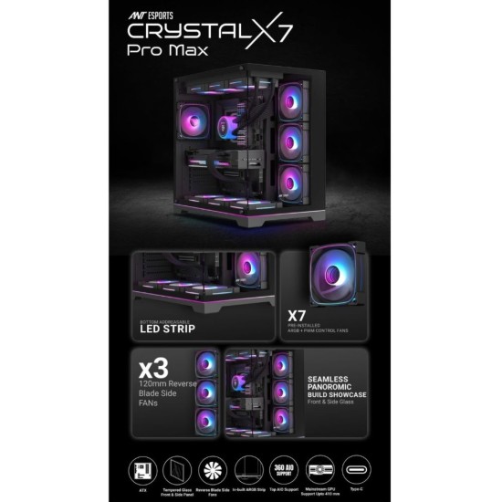 ✅ The Ant Esports Crystal X7 Pro Max is a premium mid-tower gaming cabinet designed for gamers who demand both style and performance. Equipped with 6 ARGB fans and full 360mm liquid cooling support, it ensures powerful airflow and stunning aesthetics. Its tempered glass design, wide GPU clearance, and customizable RGB lighting make it perfect for high-end gaming builds.