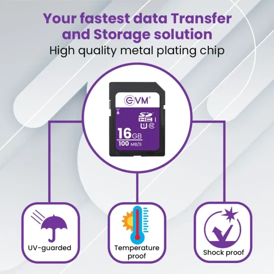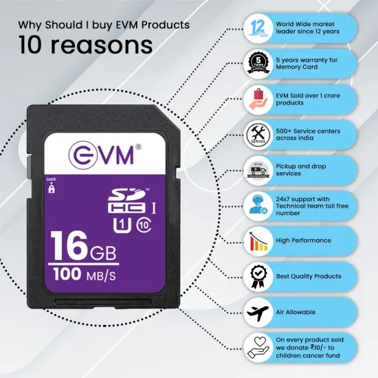 тЬЕ The EVM SDHC 16GB Class 10 Memory Card offers dependable performance for cameras, DVRs, and multimedia devices. With Class 10 / U1 speed, it ensures smooth Full HD video recording and fast data transfer. Built with smart power management and CPRM protection, it provides durability and safety for your valuable data while maintaining energy efficiency.