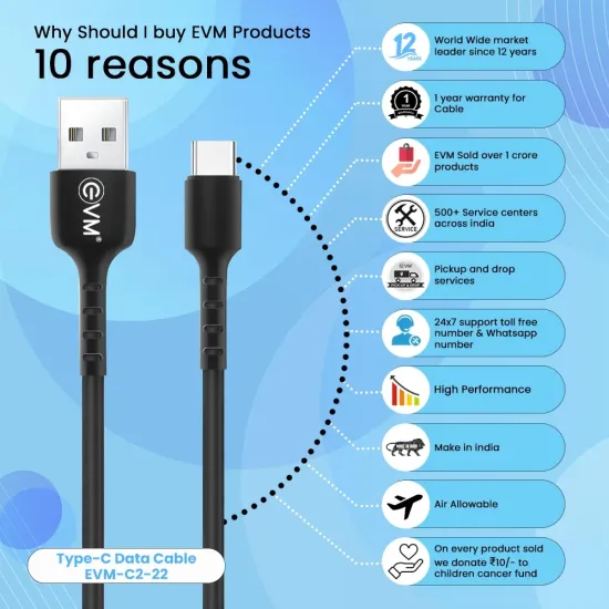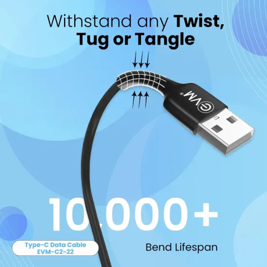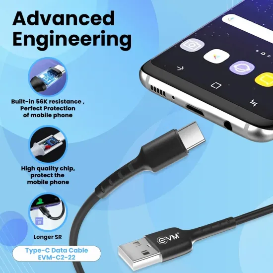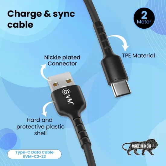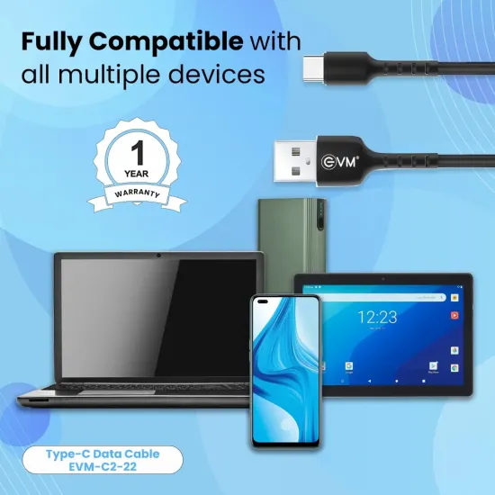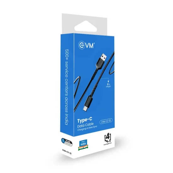 EVM Type-C Charge & Sync Cable EVM-C2-22-B is a durable and high-speed cable designed for fast charging and reliable data transfer. Featuring a reversible Type-C connector, it ensures easy plug-in and compatibility with smartphones, tablets, and laptops. Built with premium materials, it offers enhanced durability, flexibility, and resistance to tangling. The cable supports high-speed charging and efficient syncing for both Android and Type-C enabled devices. Available at Golchha Computer, this EVM cable is the perfect combination of performance, reliability, and long-lasting quality for everyday use.