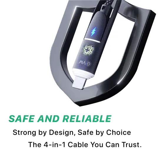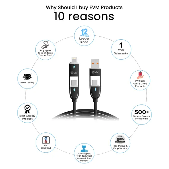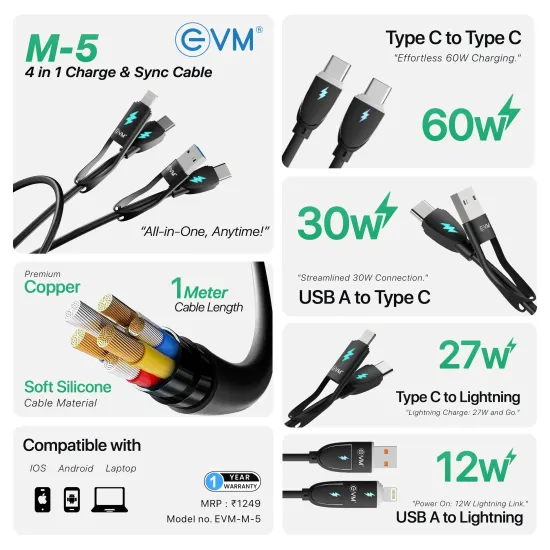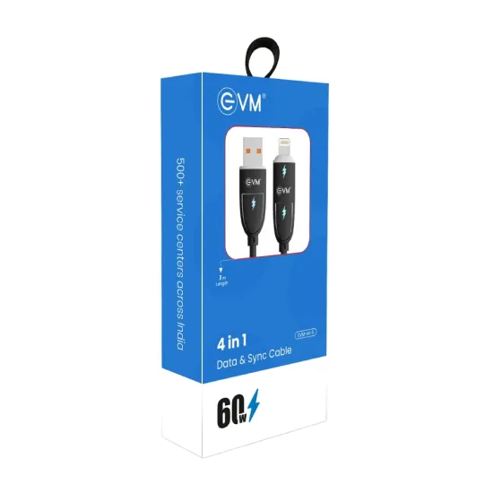 EVM 4-in-1 Charge & Sync Cable 60W 1M (USB | iPhone | Type-C) – EVM-M-5-B is a versatile multi-function cable that includes USB, iPhone, and Type-C connectors in a single solution. With 60W fast charging support, it ensures quick power delivery and efficient data transfer. The 1-meter length makes it convenient for everyday use. Available at Golchha Computer, this cable offers a reliable and durable charging experience.