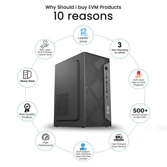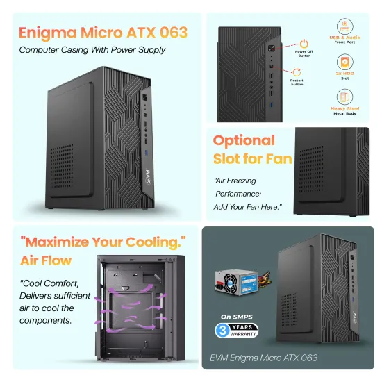 ✔ EVM Enigma Micro ATX 063 Cabinet Stylish Compact Design के साथ आता है — Micro ATX और ITX Motherboards Support करता है और Pre-Installed SMPS के साथ PC Build के लिए Best Budget Option है!