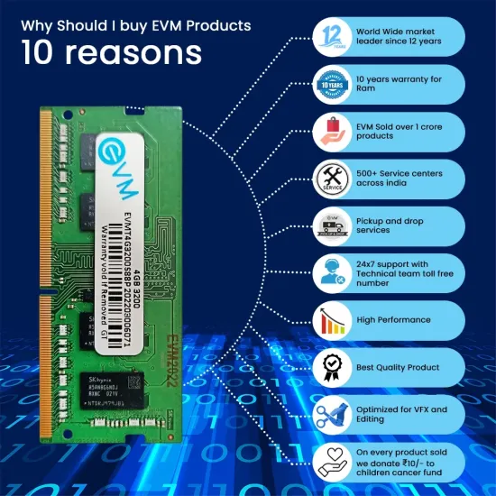 ⚡ EVM 4GB DDR4 3200MHz RAM आपके लैपटॉप की मल्टीटास्किंग और परफॉर्मेंस को बेहतर बनाता है। हाई-स्पीड और लो वोल्टेज डिज़ाइन इसे अधिक पावर एफिशिएंट और स्मूद परफॉर्मेंस प्रदान करता है।