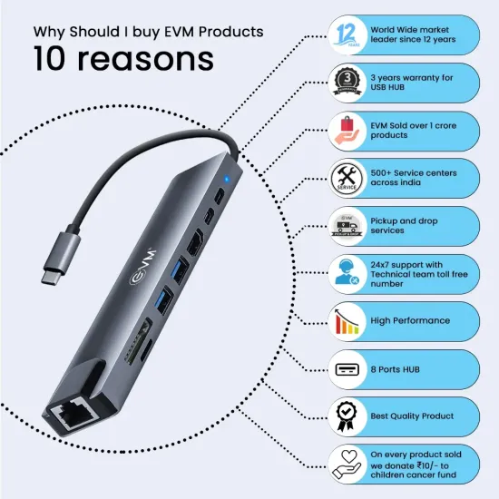 EVM TYPE‑C HUB Dock 8-in-1 (HDMI | USB | LAN | TF | SD CARD | TYPE‑C) is a versatile multi-port hub designed to expand connectivity for laptops and devices with a Type‑C port. It offers HDMI output, multiple USB ports, LAN port, TF & SD card slots, and a Type‑C pass-through — ideal for productivity, connecting external displays, networking, data transfer, and more. Available at Golchha Computer, this hub provides a compact and efficient solution for users seeking flexible device connectivity across India.