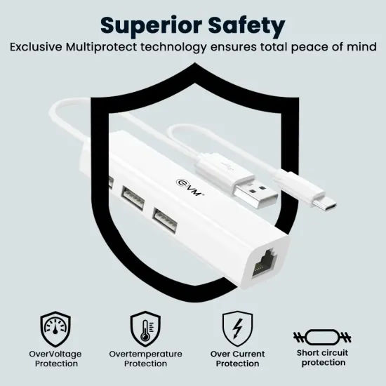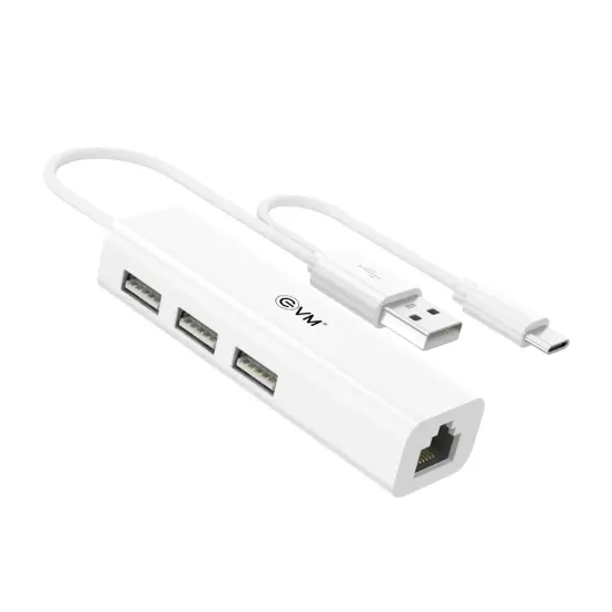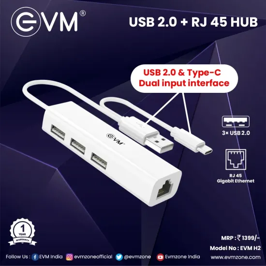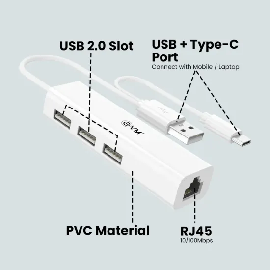 EVM Type‑C + USB to USB Hub 3 Ports 2.0 With LAN (H2) (A1652) is a versatile connectivity solution for laptops and devices featuring Type‑C or USB ports. It expands connectivity by providing 3 additional USB 2.0 ports and a LAN port — ideal for connecting keyboards, mice, pen drives, external drives, and wired network connections simultaneously. Available at Golchha Computer, this hub offers a compact, efficient, and practical solution for users across India.