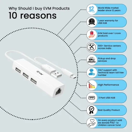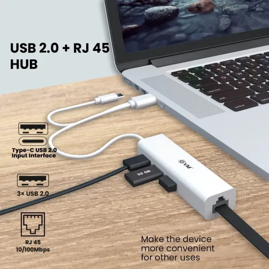 ✅ EVM H2 USB Hub with RJ45 LAN आपके पीसी और लैपटॉप के लिए एक कॉम्पैक्ट और भरोसेमंद हब है। इसमें 3 USB 2.0 पोर्ट्स और RJ45 LAN पोर्ट शामिल हैं, जिससे आप एक साथ कई डिवाइसेस को कनेक्ट और ब्रॉडबैंड नेटवर्क का उपयोग कर सकते हैं।