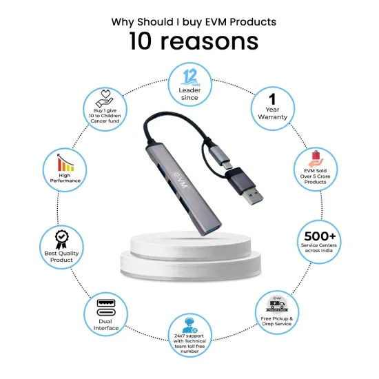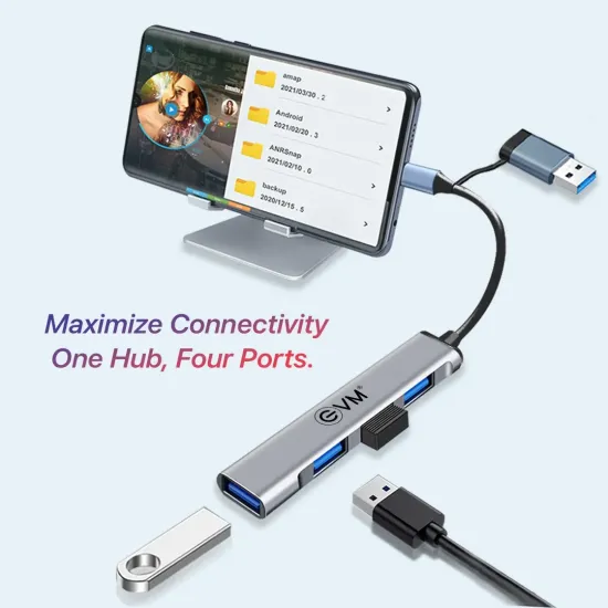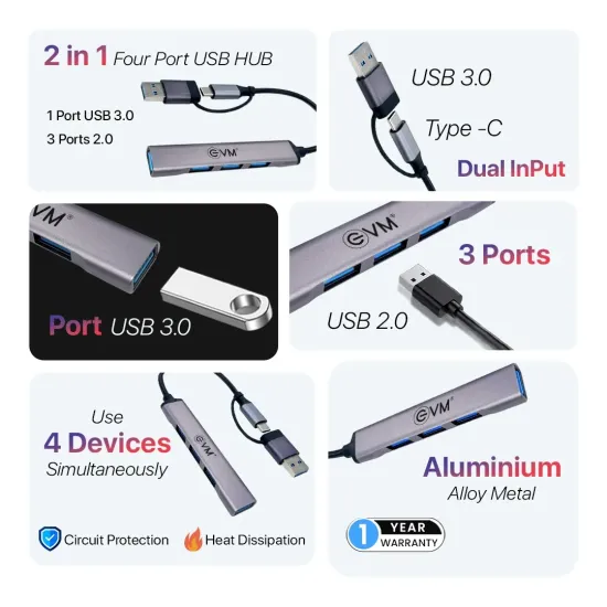 EVM Type-C+USB to USB Hub 4 Port USB 3.0 (CU4HP) offers seamless connectivity with four high-speed USB 3.0 ports, making it ideal for expanding ports on laptops and desktops. Its compact design ensures easy portability while providing stable data transfer for multiple devices. Available at Golchha Computer, this hub is perfect for users needing efficient and reliable Type-C and USB hub solutions.