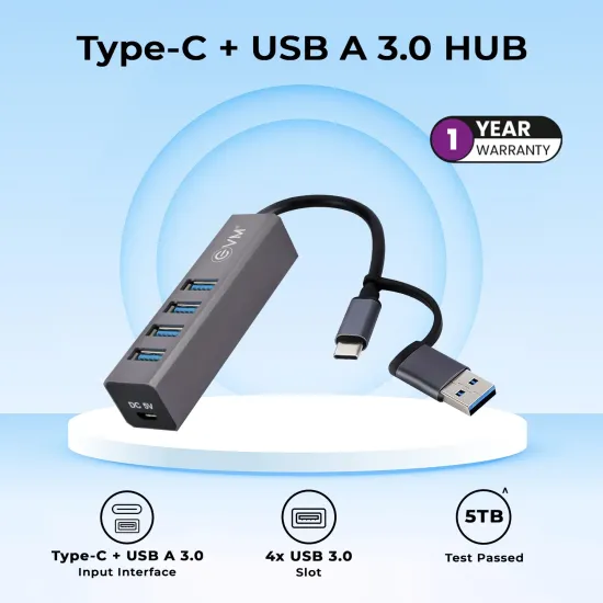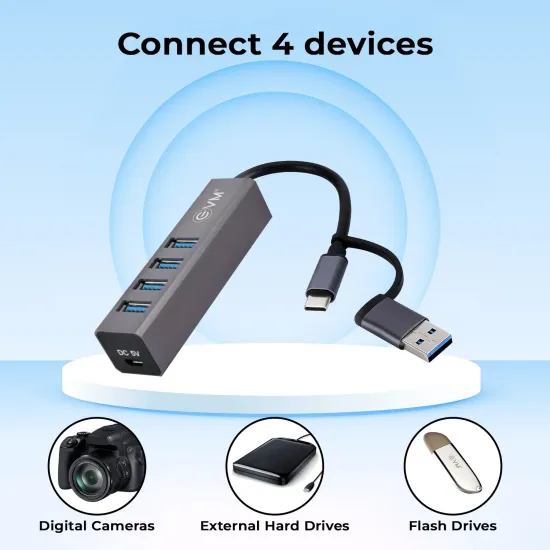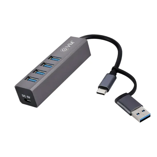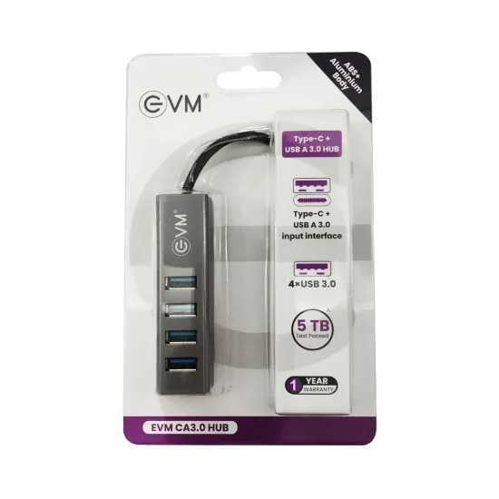 EVM Type-C + USB to USB 3.0 Hub 4 Port (CA3.0-HUB) is a dual-interface high-speed hub that supports both Type-C and USB inputs, making it compatible with a wide range of devices. Equipped with four USB 3.0 ports, it ensures rapid data transfer and smooth connectivity for peripherals like keyboards, mice, flash drives, and more. Compact and lightweight, it is ideal for laptops, desktops, and modern smartphones. Available at Golchha Computer, this hub provides a reliable and efficient port expansion solution.