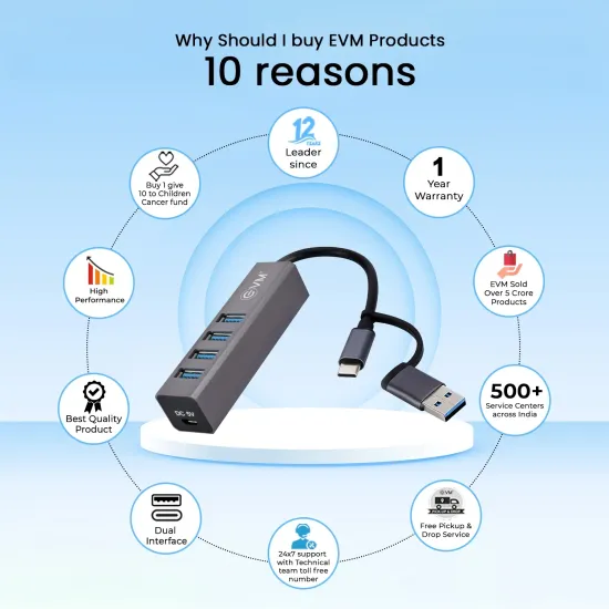 ✅ EVM CA3.0HUB एक हाई-स्पीड USB हब है जो एक साथ 4 डिवाइसेस को कनेक्ट करने की सुविधा देता है। 5Gbps तक की स्पीड, मजबूत एल्युमिनियम बिल्ड और SSD/HDD के लिए एक्सटर्नल पावर सपोर्ट इसे पेशेवर और रोज़मर्रा के उपयोग दोनों के लिए बेस्ट बनाता है।