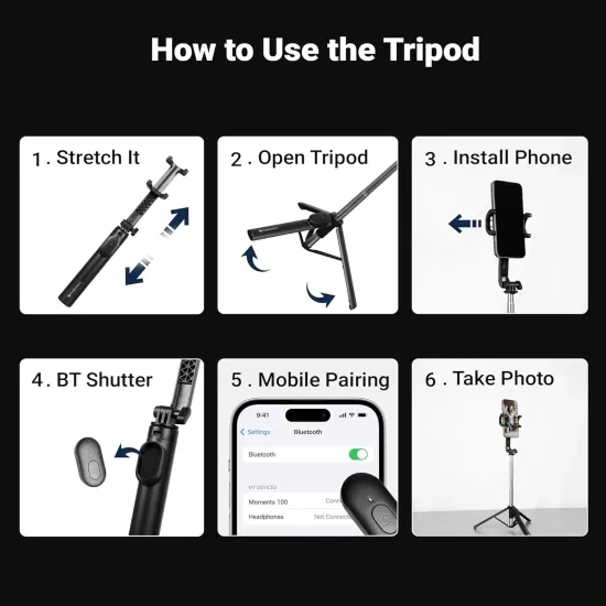 ✅ This Adjustable Selfie Stick with Bluetooth Shutter features a sturdy stainless steel arm, full 360° rotation, and a secure grip—making it perfect for selfies, vlogging, travel photography, and video calls.