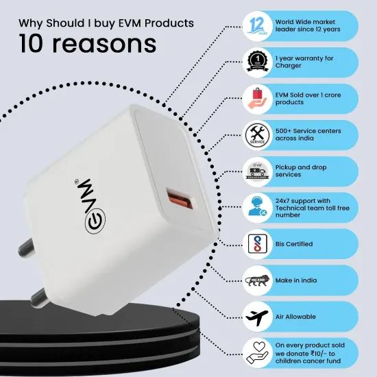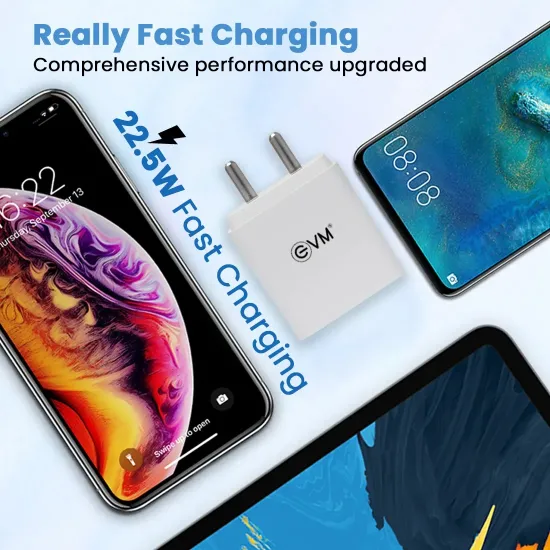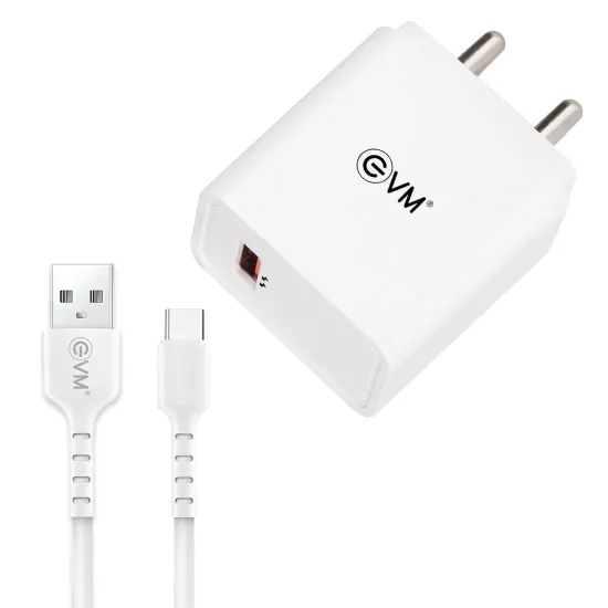 EVM Mobile Charger with Type-C Cable QC 3.0 (USB to Type-C) 22.5W delivers fast and efficient charging with QC 3.0 support and a powerful 22.5W output, ensuring quick power delivery for compatible smartphones and devices. Supplied with a USB to Type-C cable, it is designed for reliable everyday use with stable performance. Available at Golchha Computer, this EVM mobile charger offers a dependable and high-speed charging solution for Indian customers.