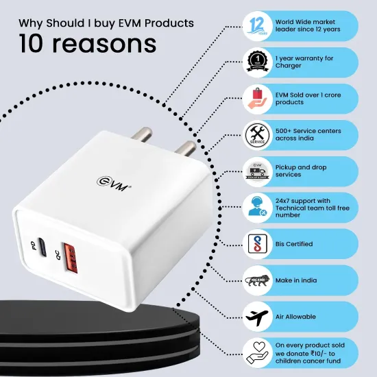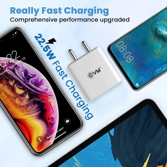 тЬЕ The EVM QC+PD P22-W Charger delivers reliable fast charging with dual USB and Type-C ports, supporting both PD and QC protocols along with comprehensive safety protections for secure everyday use.