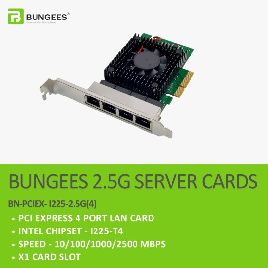 BUNGESS PCI Express X1 2.5G 4 Port LAN Card is a high-performance network expansion card designed to provide four 2.5 Gigabit Ethernet ports through a PCI Express X1 interface. Ideal for servers, workstations, and advanced networking setups, it delivers fast, stable, and efficient wired connectivity for multi-network environments. Available at Golchha Computer, this LAN card offers a reliable and scalable networking solution for Indian users.