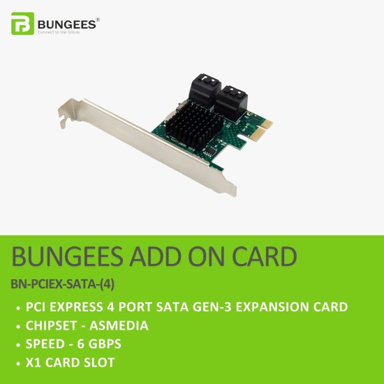 тЬЕ The Bungees BN-PCIEX-SATA-(4) add-on card allows you to expand your system with four additional SATA Gen-3 ports via a PCIe x1 slot. Powered by an ASMedia chipset, it delivers reliable 6 Gbps data transfer speedsтАФideal for desktops and servers needing extra HDD or SSD connectivity.