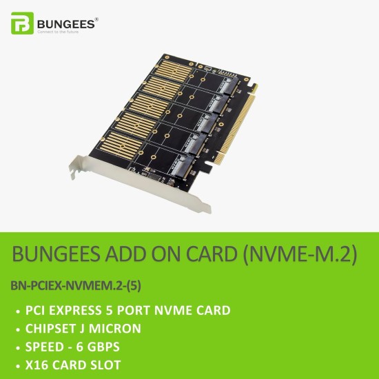 тЬЕ The Bungees BN-PCIEX-NVMEM.2-(5) NVMe add-on card is designed to expand high-speed storage capacity by supporting up to five M.2 NVMe SSDs through a PCIe x16 slot. Powered by a JMicron chipset, it is ideal for workstations, servers, and storage-intensive applications requiring scalable NVMe expansion.