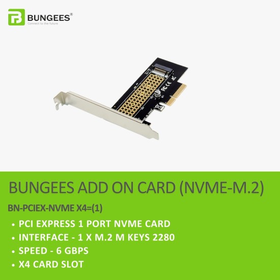 тЬЕ The Bungees BN-PCIEX-NVME X4-(1) add-on card enables high-speed NVMe M.2 SSD expansion through a PCIe x4 slot. Supporting M-Key 2280 NVMe drives, it is an ideal solution for desktops and workstations that require fast storage upgrades or additional NVMe capacity.