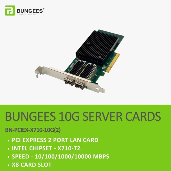 тЬЕ The Bungees BN-PCIEX-X710-10G(2) is a dual-port 10 Gigabit server network card designed for enterprise servers and data center environments. Equipped with the Intel X710-T2 chipset and PCIe x8 interface, it ensures stable, high-throughput connectivity for virtualization, cloud infrastructure, and bandwidth-intensive workloads.