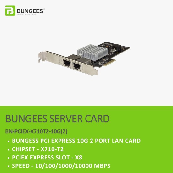 тЬЕ The Bungees BN-PCIEX-X710T2-10G(2) is a dual-port 10 Gigabit server network card engineered for enterprise servers and high-performance networking environments. Featuring the Intel X710-T2 chipset and PCIe x8 interface, it delivers stable, low-latency 10GbE connectivity for virtualization, storage servers, and data-intensive workloads.