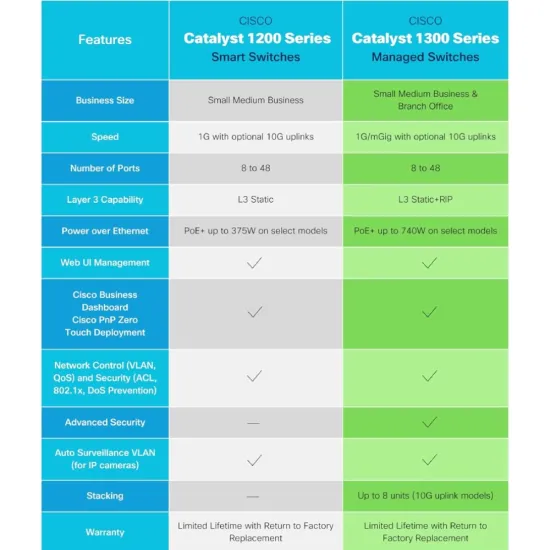| Ease of Use | Easy setup & management via Cisco Business mobile app, web interface, and centralized dashboard with step-by-step guided instructions |