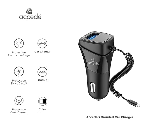 тЬЕ The Accede Duetox 2.4A Fast Charging Car Charger is designed to deliver reliable and efficient charging while you are on the road. With its powerful 2.4A output and premium build quality, it ensures fast and stable charging for your smartphone. The included Micro USB cable makes it ready to use out of the box, while advanced safety protection keeps your devices secure. Its compact design and elegant black finish make it a perfect fit for any car interior.