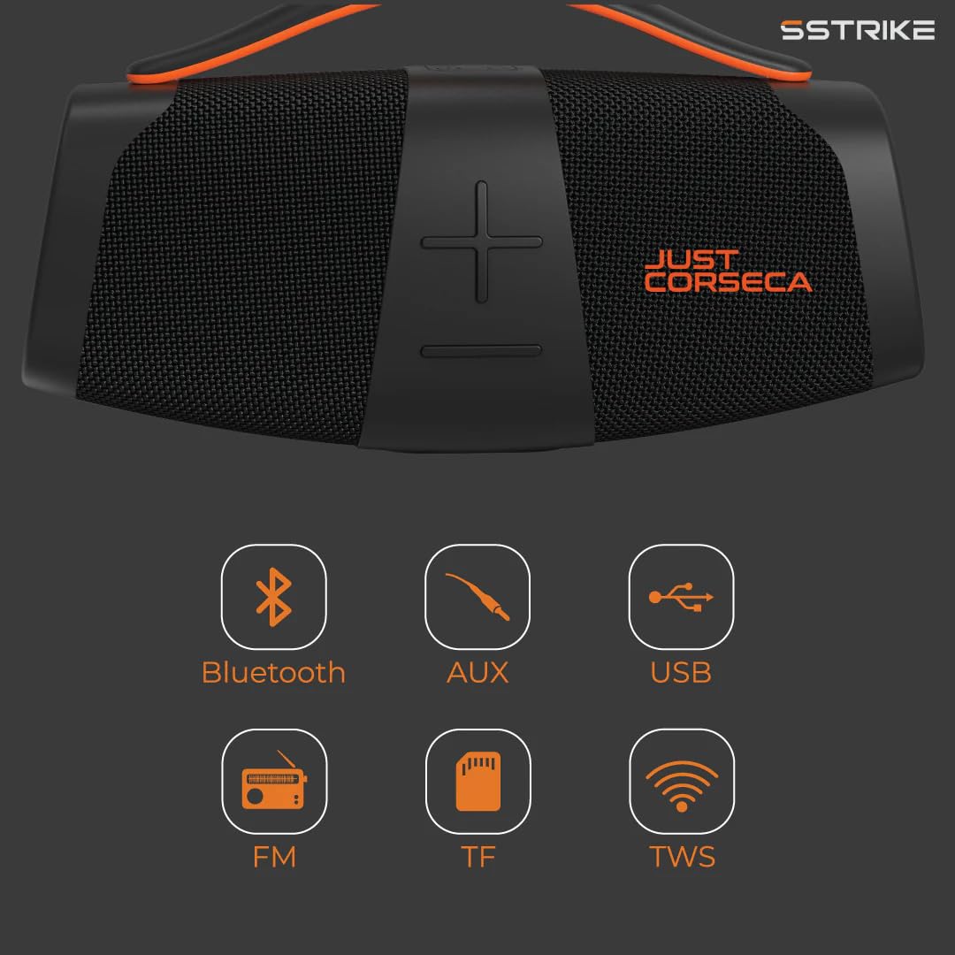 JUST CORSECA SSTRIKE JST612 Bluetooth Speaker 40W with 2400 mAh Battery and 6 Hours Playtime (Black, 2.0 Channel) delivers powerful audio performance with a 40W output and 2.0 channel sound configuration, making it ideal for parties and everyday listening. Featuring a built-in 2400 mAh battery, this Bluetooth party speaker provides up to 6 hours of continuous playtime on a full charge. Designed for stable wireless connectivity and portability, it ensures dependable performance on the go. Available at Golchha Computer, it offers a high-quality and entertaining audio solution for Indian customers.
