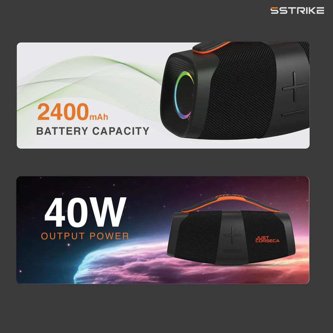 ✅ The JUST CORSECA SSTRIKE JST612 Bluetooth Speaker is designed to deliver powerful 40W stereo sound with deep bass and clear audio output. Featuring a 2.0 channel configuration and a high-capacity 2400 mAh battery, this party speaker provides up to 6 hours of continuous playback for uninterrupted entertainment. Its portable and stylish design makes it perfect for parties, outdoor gatherings and home use, while Bluetooth connectivity ensures quick and stable wireless pairing with your devices.