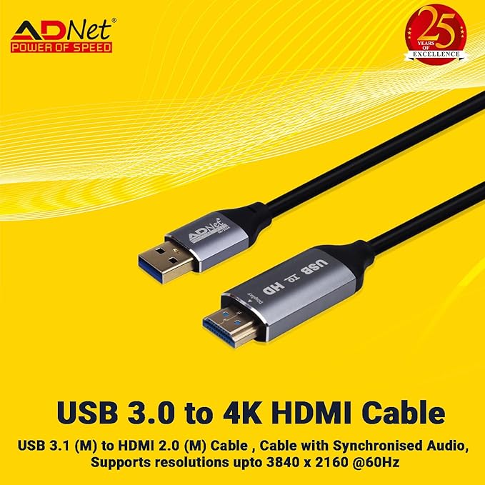 тЬЕ The AD NET ADP-UH-1188 USB 3.0 to 4K HDMI Cable allows you to connect your laptop or desktop to a 4K display with crystal-clear video and synchronized audio. Supporting resolutions up to 3840x2160 @60Hz, this 1.8-meter cable ensures smooth performance for presentations, gaming, and high-definition entertainment.
