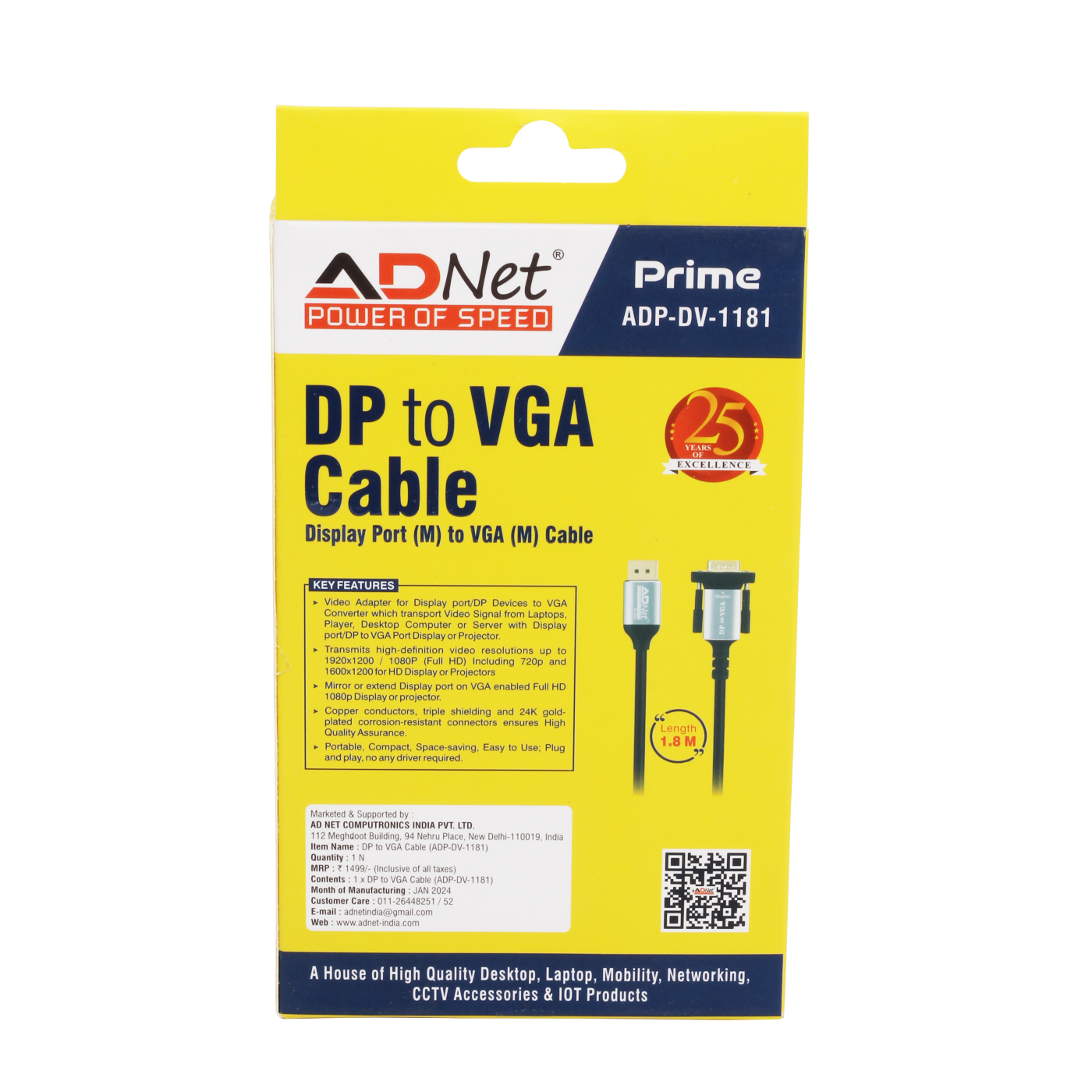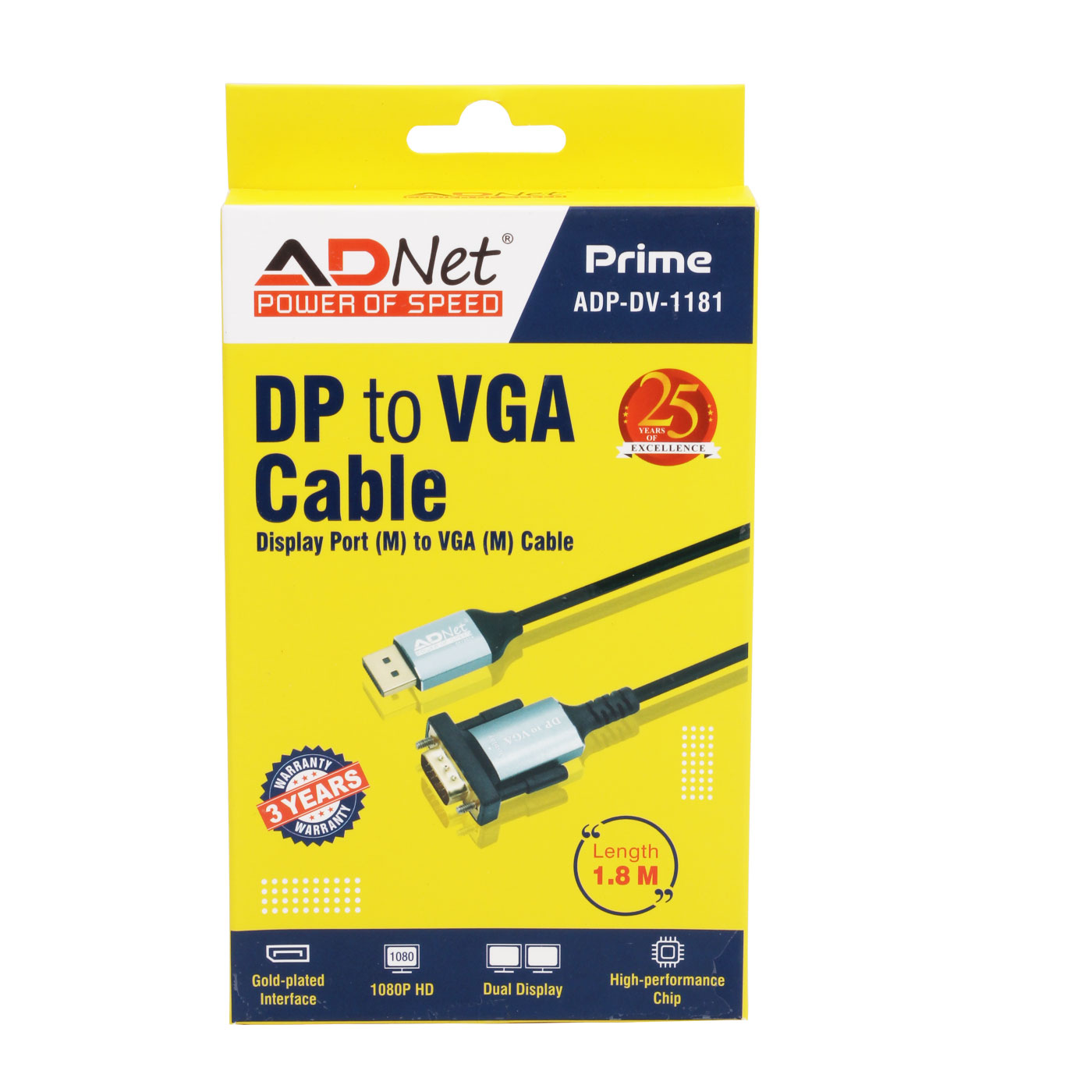ADNET PRIME DP (M) to VGA (M) Cable, Length 1.8M ADP-DV-1181 provides reliable connectivity from DisplayPort (Male) to VGA (Male), enabling seamless connection between modern devices and VGA-supported monitors or projectors. Designed for stable video transmission, it ensures clear display performance for office, educational, and presentation setups. The 1.8-meter length offers flexible installation and convenient usage. Available at Golchha Computer, this cable is a practical display solution for Indian customers.