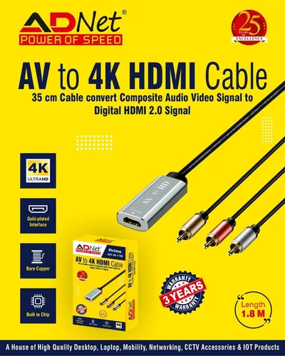 тЬЕ The ADNET 4K AV to HDMI Cable ADP-AH-1190 is designed to connect AV (RCA) devices to modern HDMI TVs and monitors. With compact 35CM length and support for high-resolution output, it ensures smooth audio and video transmission, making it ideal for home entertainment setups.
