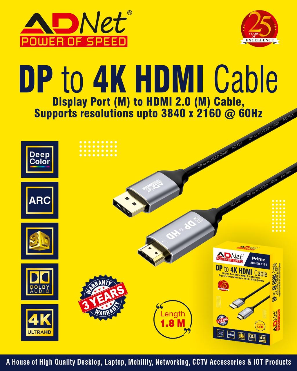 ✅ The ADNET DP to 4K HDMI Cable (ADP-DH-1184) allows you to connect a DisplayPort-enabled computer or laptop to an HDMI monitor, TV, or projector. With support for up to 4K Ultra HD resolution and a 1.8-meter length, it delivers clear video and stable performance for office work, presentations, gaming, and home entertainment.
