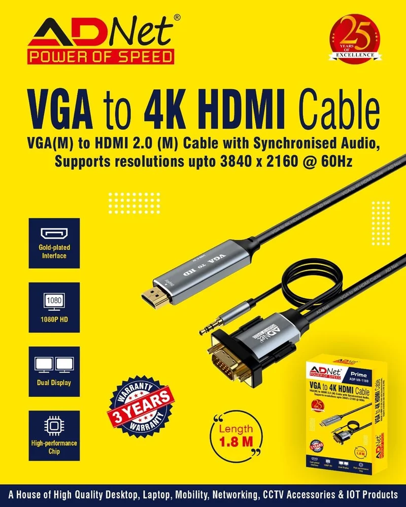ADNET VGA to HDMI Cable 1.8M – ADP-VH-1189 allows you to connect VGA-enabled devices to HDMI displays with clear video output and stable performance. With a 1.8-meter cable length, it offers flexible installation for monitors, TVs, and projectors in home or office setups. Designed for reliable signal conversion and smooth display connectivity, this cable is ideal for presentations, multimedia use, and extended display setups. Available at Golchha Computer, it provides dependable and convenient connectivity solutions.