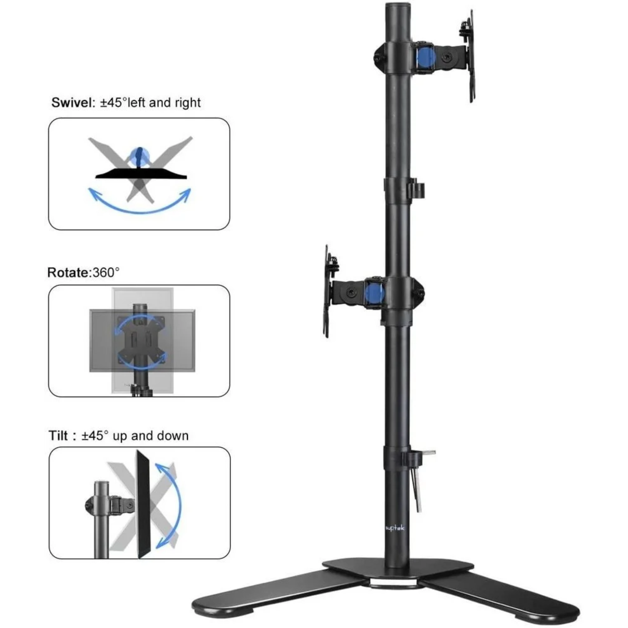 ✅ The Ultima M073 Dual LCD TV Stand is designed for 13–32 inch LCD and LED monitors with VESA 75×75 and 100×100 compatibility. It features height adjustment, 360° rotation, and ±45° tilt for flexible viewing angles. With support for both horizontal and vertical screen orientation and a maximum load capacity of 8 kg, it is ideal for office workstations, home setups, and dual-monitor productivity.
