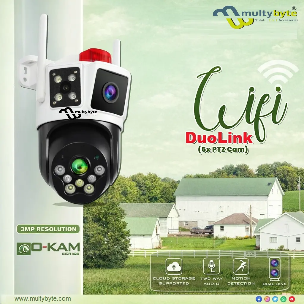 Multybyte Wifi Camera Dual Lens | 5X PTZ Camera | 3MP Resolution | Duolink offers smart surveillance with a dual lens design and clear 3MP resolution for enhanced monitoring. The 5X PTZ functionality allows flexible pan, tilt, and zoom control to cover a wider viewing area. With Duolink technology, this camera provides improved security monitoring and efficient performance for homes and offices. Its WiFi connectivity enables easy installation and convenient remote viewing through a mobile device. Available at Golchha Computer, it delivers a reliable and smart security solution for Indian customers.