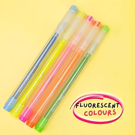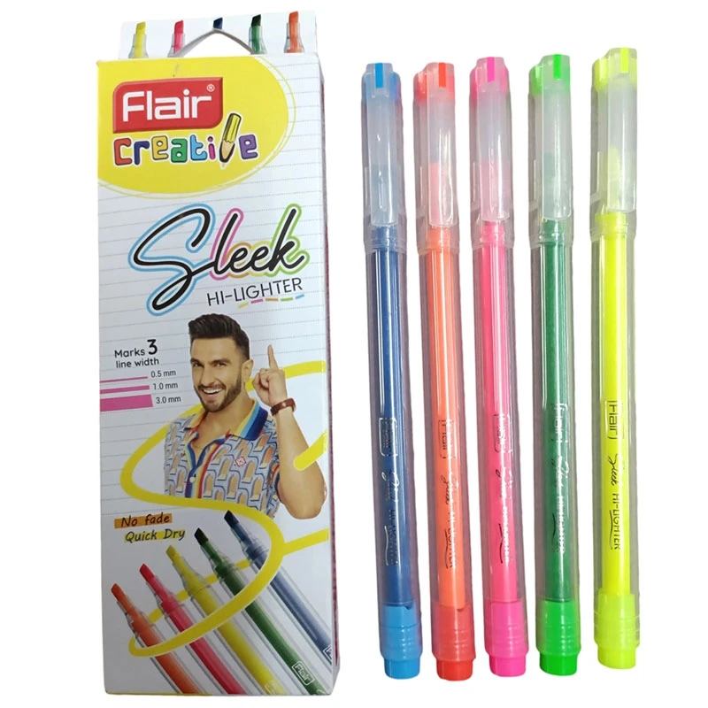 тЬЕ The Flair Creative Fluorescent Highlighter / Textliner Pack of 5 features vibrant fluorescent shades designed for clear and effective highlighting. Its chisel tip allows multiple line widths (0.5 mm, 1 mm & 3 mm) for precise marking and bold highlighting. The slim and ergonomic design ensures comfortable grip during long study or office sessions, while the quick-drying ink prevents smudging and fading, making it ideal for students, professionals, and everyday office use.