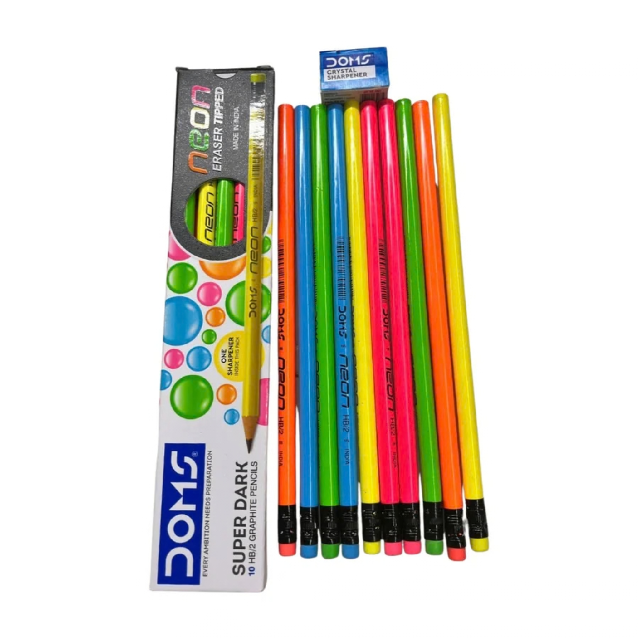 Doms Super Dark 10HB/2 Graphite Pencils Eraser Tipped 1 Sharpener 10 Pieces deliver smooth writing and dark graphite for clear and consistent lines. Designed with eraser-tipped pencils for quick corrections, this pack also includes a sharpener for convenient everyday use. Ideal for schoolwork, sketching, and general writing, these pencils offer comfortable grip and reliable performance. Available at Golchha Computer, this pack of 10 pencils provides a practical stationery solution for students and Indian customers.