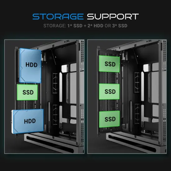 | Drive Bays | 1× HDD + 2× SSD OR 2× HDD + 1× SSD OR 3× SSD |