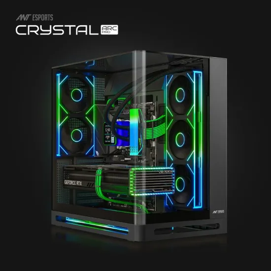 Ant Esports Crystal ARC Pro Gaming Cabinet (Black) is designed for high-performance PC builds with support for ATX, Micro-ATX, and ITX motherboards. It features a stylish crystal-clear panel design, providing a premium look while showcasing internal components. With optimized airflow support and ample space for cooling solutions and hardware expansion, it ensures efficient system performance. Its sturdy build and modern design make it ideal for gamers and PC enthusiasts. Available at Golchha Computer, it is a perfect choice for building a powerful and visually appealing setup.