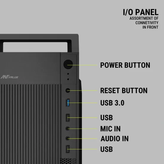 Ant Value Mid Tower Cabinet (M-ATX/M-ITX) VM5P with SMPS features a compact mid tower design compatible with M-ATX and M-ITX motherboards. It comes with a pre-installed SMPS, offering a convenient and cost-effective solution for building a PC. The cabinet ensures proper airflow and easy installation of components, making it suitable for home, office, and entry-level PC setups. Available at Golchha Computer, this cabinet provides a reliable and value-oriented choice for Indian users.