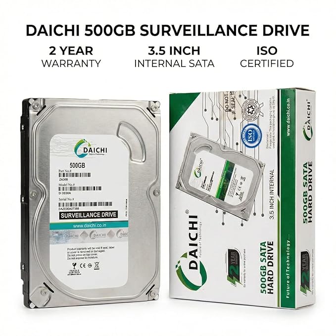 DAICHI 500GB SATA HDD 3.5 Inch Portable & Reliable Storage Hard Drive Desktop Surveillance Internal Hard Disk Drive Fast Data Transfer offers dependable 500GB storage capacity for desktops and surveillance systems. Designed in a 3.5-inch form factor, it ensures compatibility with standard setups while delivering stable performance and fast data transfer speeds. Ideal for storing files, backups, and continuous recording, it provides reliable and efficient storage for everyday use. Available at Golchha Computer, this hard drive is a practical and cost-effective solution for Indian users.