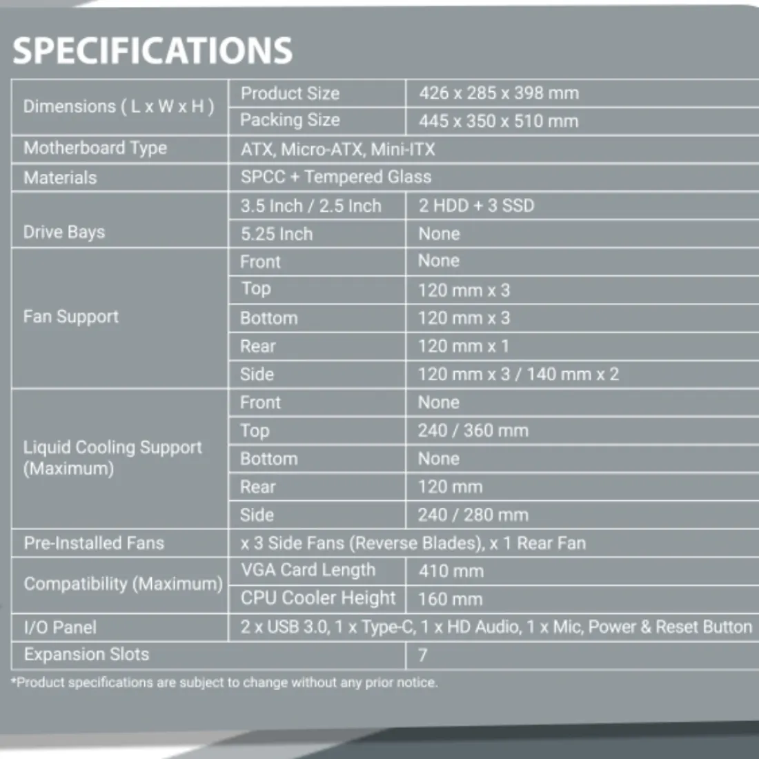 | Pre-Installed Fans | 3 x Side Fans (Reverse Blades), 1 x Rear Fan |
